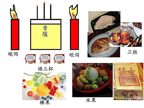準備供品:三牲、水果3樣、酒三杯、糖果、壽金、刈金、土地公金、五路財神金。